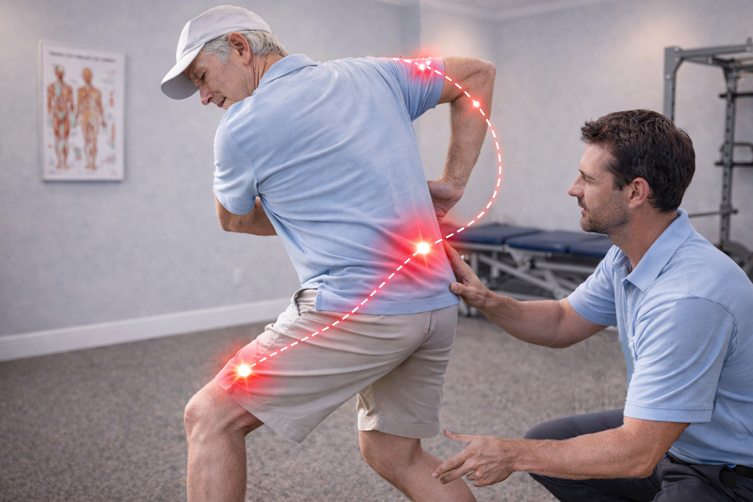 When the hips become stiff or weak—often due to aging, sitting for long periods, or past injuries—the body still tries to complete the swing. To make up for the lost hip motion, other joints are forced to work harder.